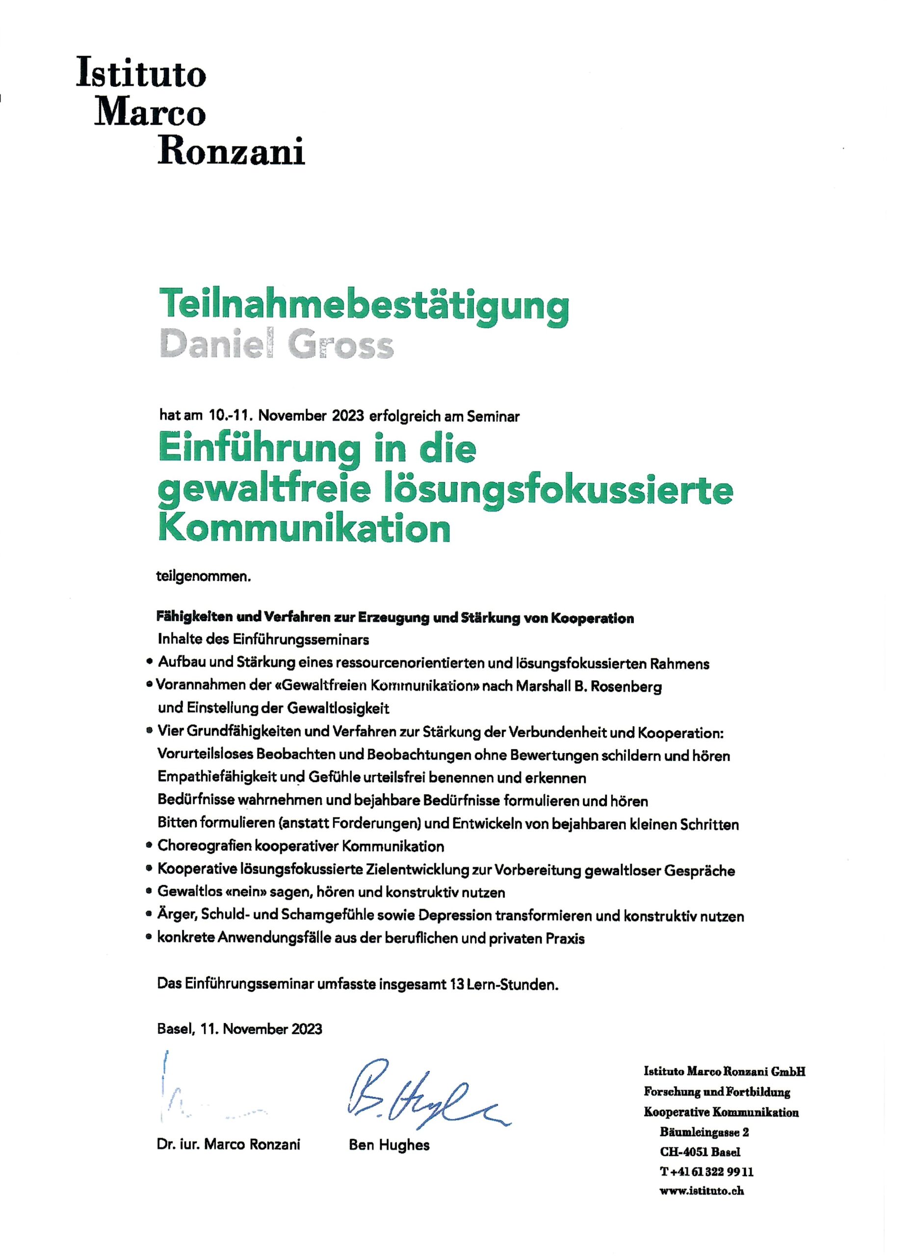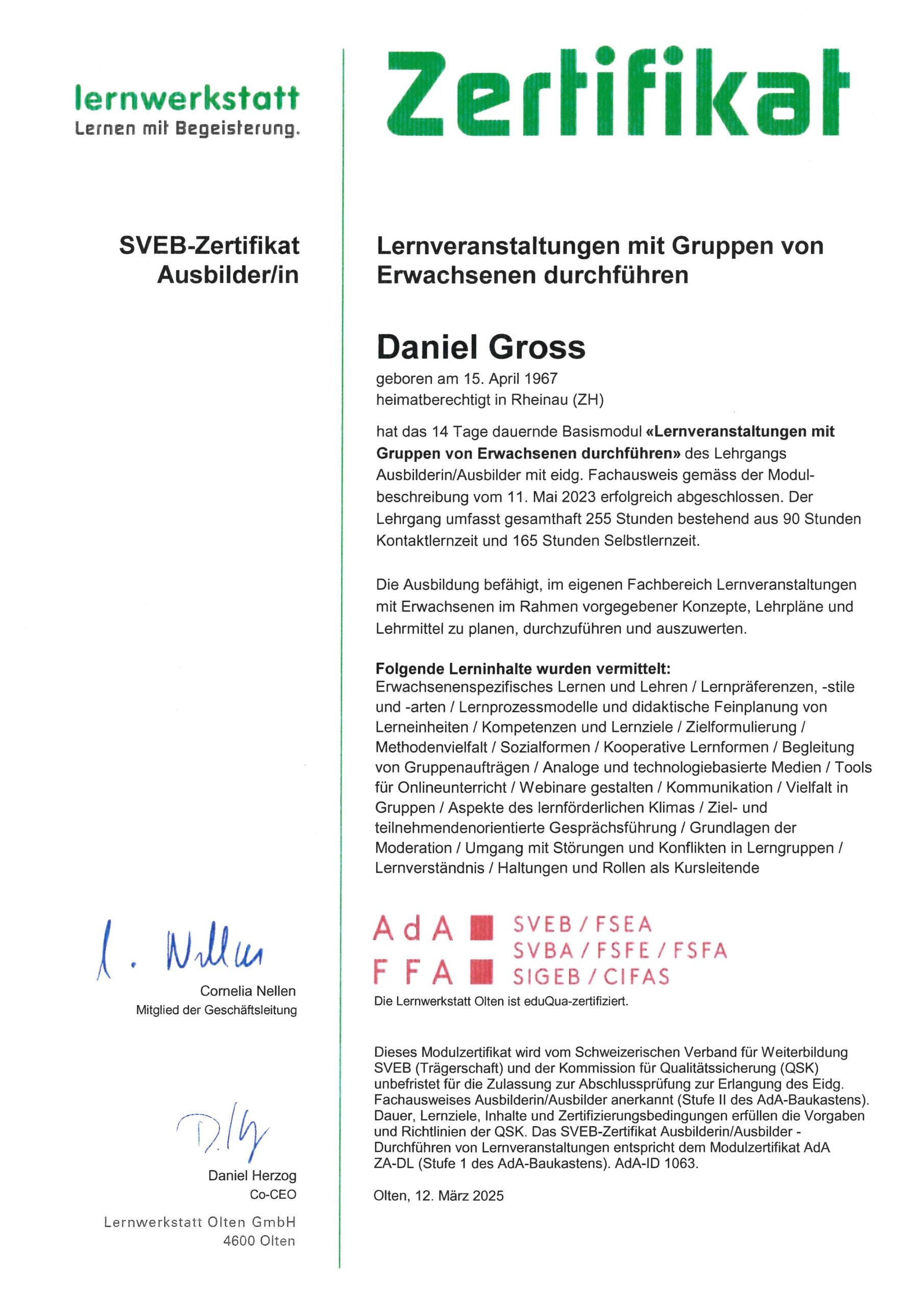 Mit meiner äusserst vielseitigen und langjährigen Berufs- aber auch Lebenserfahrung kenne ich alle Facetten des Erwerbslebens und möchte dieses Wissen und diese Erfahrung in Ihr Unternehmen einbringen um die Zusammenarbeit kooperativer und reibungsloser zu gestalten – Mit Daniel Gross und GROSS COACHING auf dem Weg zum gemeinsamen Erfolg!